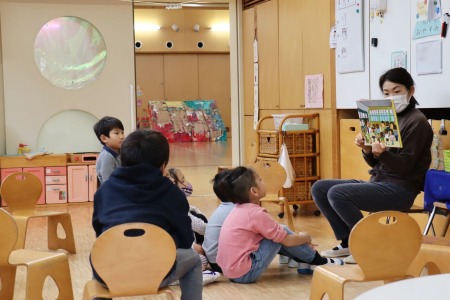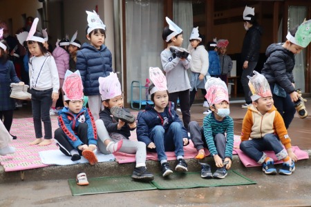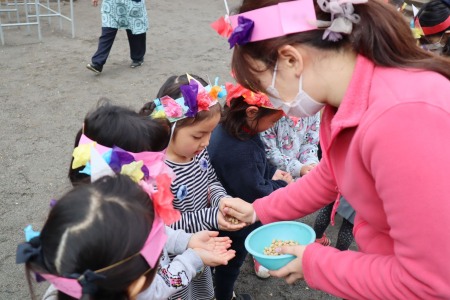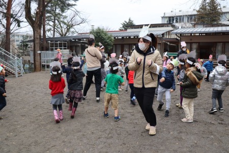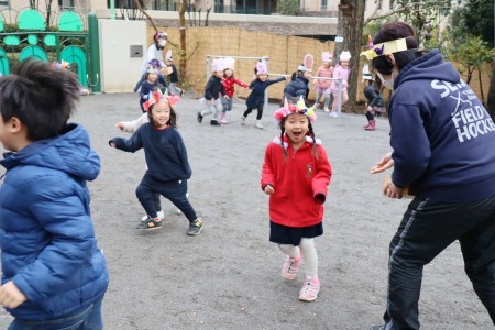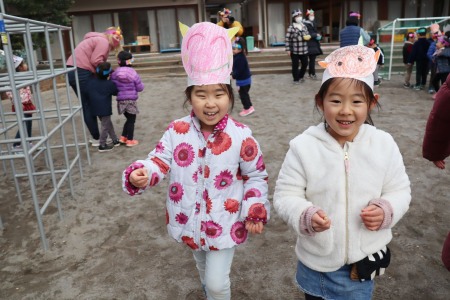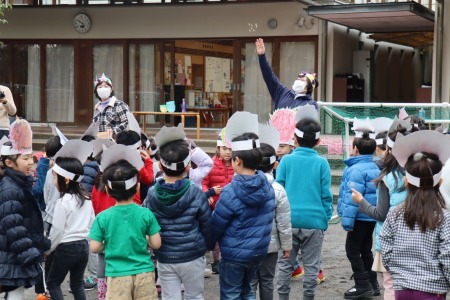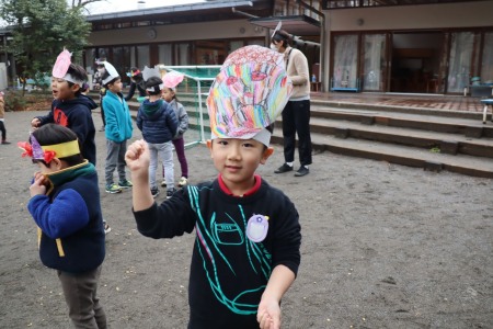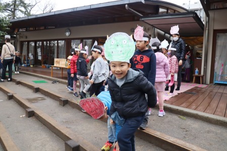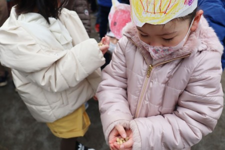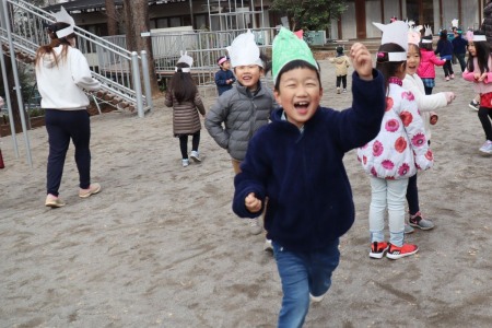 毎年恒例の豆まき。今年は分散登園のため2月1日・2日の2回にわけて行いました。手作りした鬼のお面をかぶって、子ども達は元気いっぱい。最初は子ども達が鬼役で先生たちに追いかけられます。次に子ども達が豆を投げて鬼役の先生たちを退治しました。園長先生から「鬼は自分の中にいます。自分で、ここがよくないなぁ変えたいなぁと思うこと、誰でもあるよね。そういう鬼を自分の心の中から追い出す気持ちで豆まきをしましょう。」というお話がありました。園庭を走り回る子ども達の笑い声で心の中の鬼たちも退散したようです。