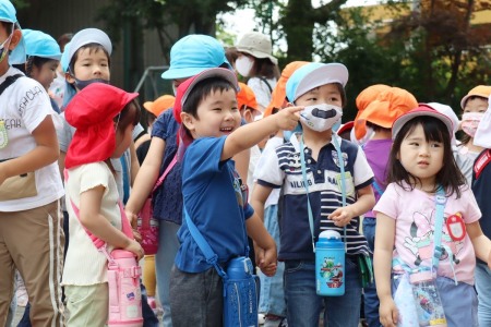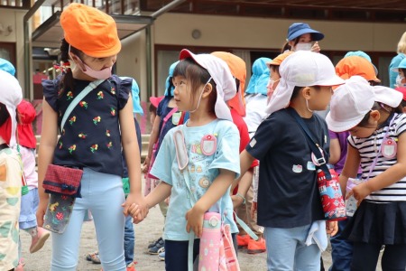 前半は年長組・年少組、後半は年中組と2グループに分かれて出発。年少さんの手を優しく引いてあげる年長さんたち