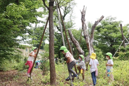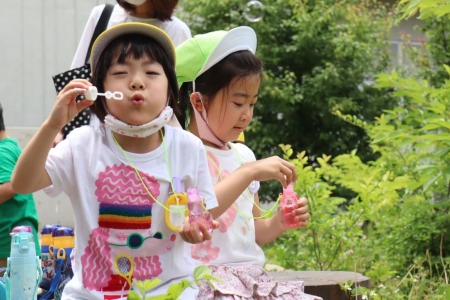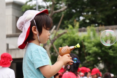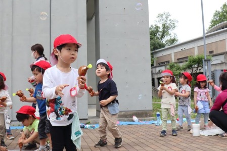 「100年の森」は現在の中高校舎建設のために移植した樹木等で作られた新しい森で、現在は大きな木や草が生える緑豊かな場所です。幼稚園の外に出て、お散歩するのが初めての年少組は、年長組のお兄さん、お姉さんと手をつないで歩きました。「猫じゃらし!」「たんぽぽだ!」「見て見てちょうちょ!」など見つけたものを指さして先生やお友だちに教えたり、お花や葉っぱを触ってみたり、楽しみながら歩きました。橋を渡り、中高生が授業をするグラウンドを眺めながら横を通り、階段と坂道を登ったら100年の森に到着。年中組、年長組にとっても「100年の森」は初めての場所、初めて歩く道は色々なおどろきと発見の連続だったことでしょう。「100年の森」では、キツツキの仲間のコゲラの巣を観察したり、年長組は宝さがし、年中組と年少組はシャボン玉をして楽しみました。