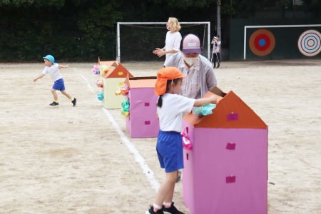 年中組による「お菓子のおうちをつくろう!」。走ってキャンディーをおうちにかざります
