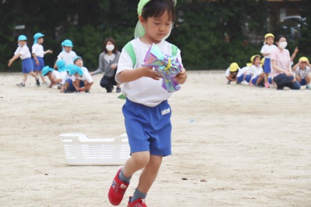 年少組の「はじめの一歩」。名前を呼ばれたら「はーい!」と元気にこたえて走ります