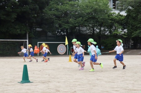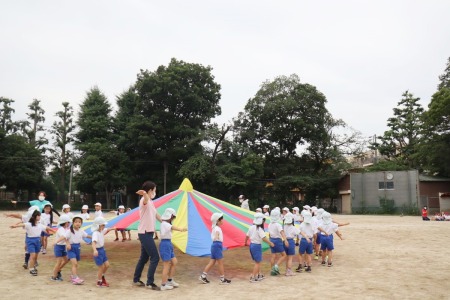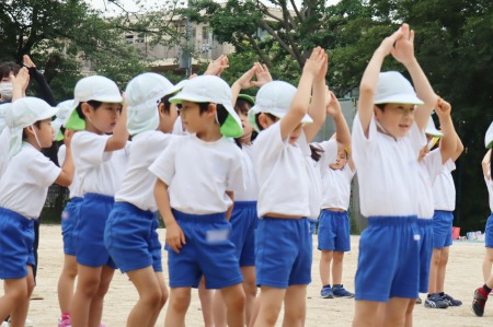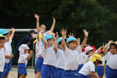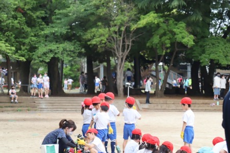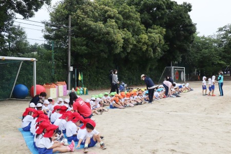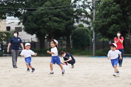 6月7日、「プレイデー」を行いました。当初は春の運動会を予定していましたが、緊急事態宣言の延長により、「プレイデー」として短縮し、さらに保護者の観覧無しでの実施としました。天候不順のため2日間延期となっていましたが、待ちに待った当日、子どもたちは元気いっぱい登園し、初等学校のグラウンドでおもいきり体を動かしました。最後は国府園長の「今日はみんな一所懸命がんばりました。帰ったらお父さんお母さんにも話してあげてください」ということばにこたえて、子どもたちの「はーい!」という大きな返事がグラウンド中に響きました。