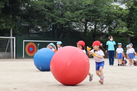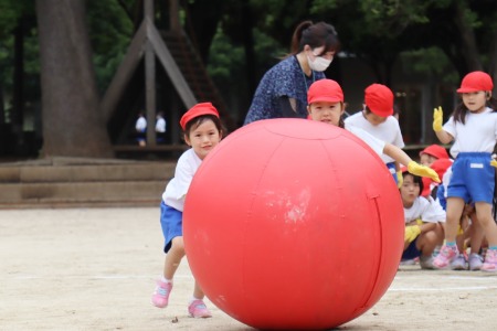 年長組と年中組合同で力を合わせて「大玉ころがし」