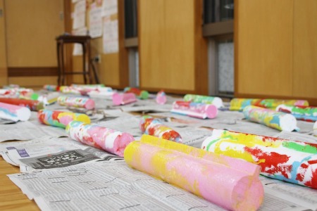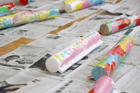 円筒に取手がついたような不思議なかたちの発泡スチロールと絵の具を使った、色あそびにチャレンジです。クルクルまわすことによって、刻一刻とカタチを変えるスチロールを良く見ながら、たくさんの色をどこにどんな順番で塗っていくのか、それぞれに想いを膨らませます。ひとつの視点から物事を判断し、彩色するのではなく、「この裏側のカタチはどうなっているのだろう?」、「見る場所を変えると、この色はどんな見え方をするのだろう?」という多角的な物事の見方や想像の仕方へと、子ども達の興味を誘います。先生からは「ゆっくり塗るときれいに塗れるよ」「持つところを変えると塗り忘れている場所がみつかるよ」というアドバイスや、「色の組み合わせがいい!」といった言葉をいただきながら、子どもたち全員がそれぞれ違った作品を完成させました。