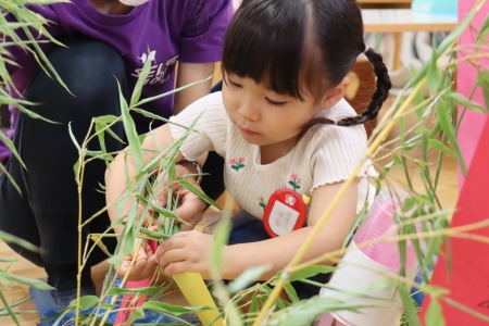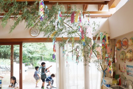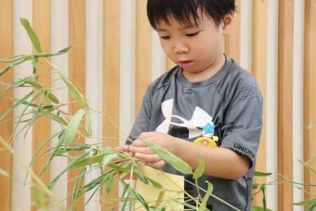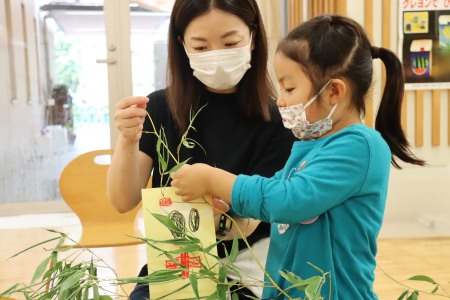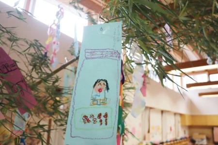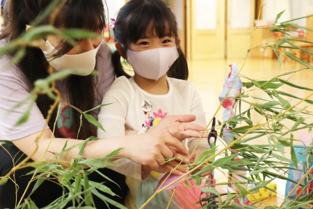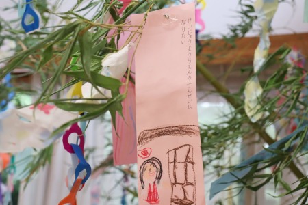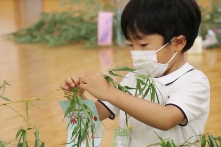 7月7日の七夕にむけて、1日(木)に幼稚園で笹の飾り付けをしました。願い事や将来の夢を描いた短冊と飾りを、それぞれのクラスの大きな笹に一人一人つけていきました。短冊には「おはなやさんになりたい」「おいしゃさんになれますように」「いぬがながいきできますように」「さんたくろーすがきますように」さらには「せいじょうようちえんのせんせいになりたい」など思い思いの願い事が。飾り付けをしながら、担任の教員と願い事のお話をする子どももいました。全員に飾り付けられた笹はそれぞれの保育室へ。みんなの願い事が叶いますように。