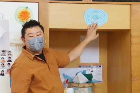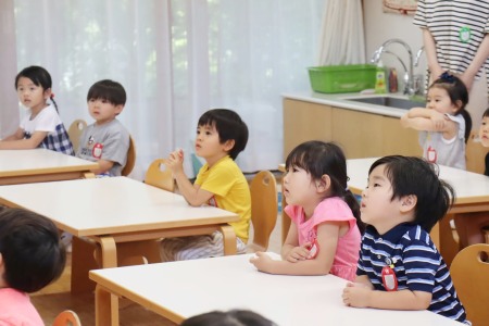 智力先生による「造形の時間」を初めて受ける年少組。説明を真剣に聞いていました