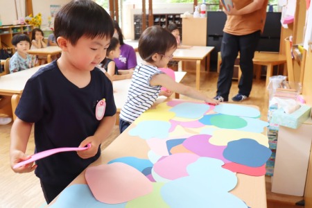 7月12日(月)、彫刻家の高橋智力先生の造形の時間をしました。今年度の年少組は智力先生の造形の時間が今回初めてです。自分表現を世界中の人に向けて直接発信出来るのが当たり前の時代となって来ている中で、まずは好きなカタチと色を自分で見つけ、自分で決められる(発見力)、もともと自分で選んだカタチから、内側に向けて少しずつ同じカタチをトレースしながら描いていったその先のカタチが、どうして最初のカタチと違うのかを考えてみる(考察力)、選んだ3つのカタチを糊付けし、どうやって一つの作品にまとめるか(構成力)といった、シンプルでありながら、3つの力の源をアートで刺激するチャレンジです。