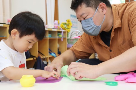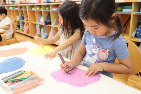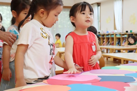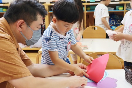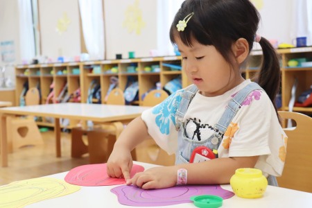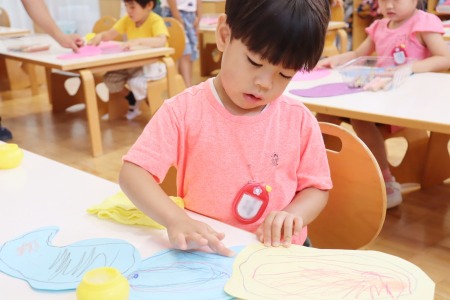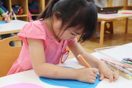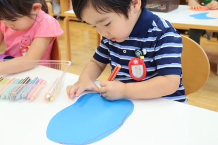 色鉛筆で線を描く作業では、できるだけ紙の形をなぞるように縁に沿って描いていきます。白い紙に描くのと、色画用紙に描くのでは、色鉛筆の見え方も違います。紙を重ね合わせて糊で貼る作業では、どこに糊をつけたら紙と紙がくっつくか、どんな形に貼り合わせたいかを考えながら作品を作っていきました。根気強く集中して作品づくりをした年少組の子どもたち。全員が作品を完成させることができました。初めての造形の時間をとても楽しんだようです。