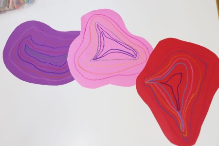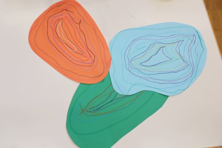 紙の形を真似して、縁に沿って色々な色で線を描いていきます
