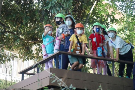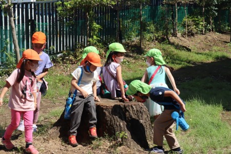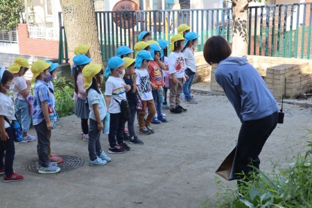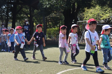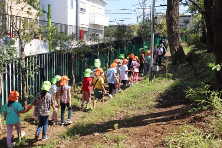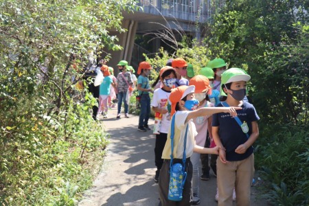 9月下旬に幼稚園の恒例行事、秋の遠足を予定していましたが、緊急事態宣言の延長に伴い、残念ながら中止いたしました。子どもたちが少しでも遠足気分を味わえる経験をと考え、9月24日(金)に初等学校へ学園内ハイキングに行きました。