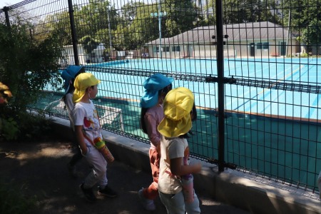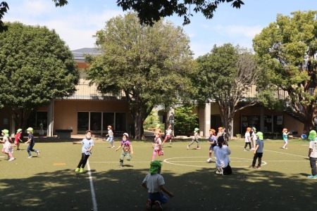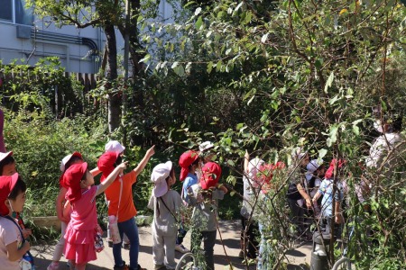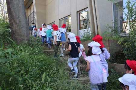 幼稚園と隣接している初等学校。幼稚園を出発して扉一つくぐるとそこはもう別世界です。普段幼稚園で過ごす園児たちにとって初等学校のグラウンドや広場、校舎はとてつもなく広く大きく感じたことでしょう。グラウンドから広場を通り、校舎の脇を通ると「かんさつの森」に到着。ちょうちょやお花、木の実を観察しながら歩き、その先の学園プールが見渡せる場所へ。日の光が当たりキラキラ光るプールを前に思わず「泳ぎたーい!」と子どもたちから声があがりました。その後は校舎裏手の「地獄谷」へ。大きな木と笹に覆われた急な斜面がある地獄谷。「先生が一緒だから怖くないよ!」と声をかける教師を先頭に地獄谷をみんなで登ります。谷から登りきると明るく開けた校舎が見え、最後はみんなで広場を思い切り走って楽しみました。