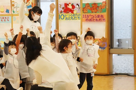 ばけちゃま登場。さいごはみんなでばけちゃまダンスを踊ります。(年少組)