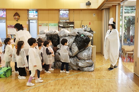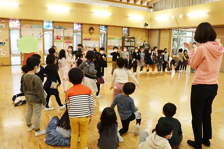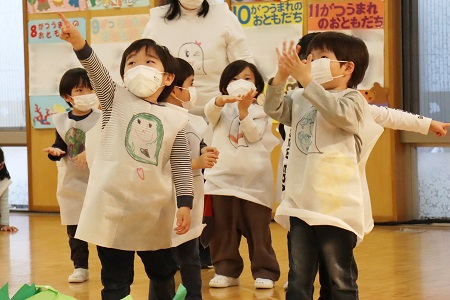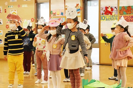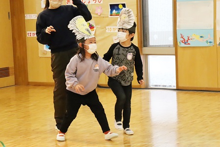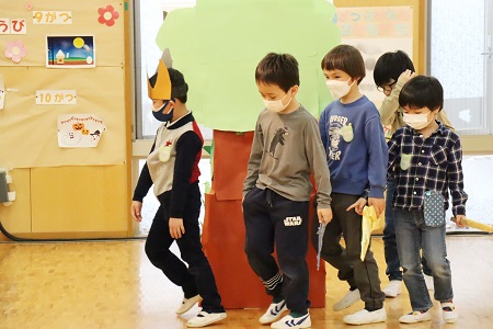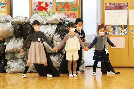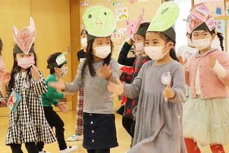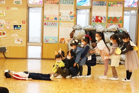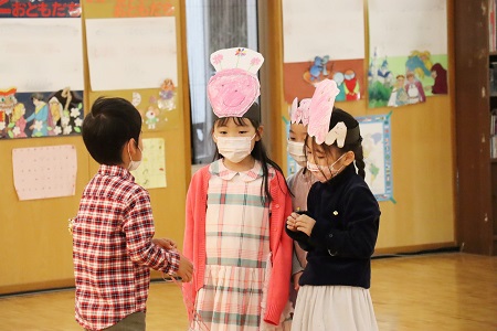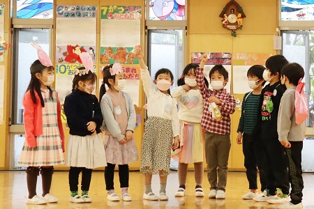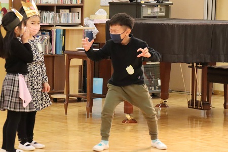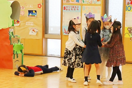 3月2日・3日の2日間にひなまつりの催しを行いました。年少組は小さなおばけに変身して「表現遊び・森に行こう!」を、年中組は様々な動物たちになって「劇遊び・森のひなまつりパーティー」を、元気なダンスとともに披露しました。年長のちゅうりっぷ組は「魔女と消えたお姫様」と「世界ワールド、襲われた姫」、ばら組は「虫の森」と「夢とメダルのお話」の4つのグループに分かれ創作劇を演じました。当日は密を避け、発表と鑑賞する2クラスのみがホールに入り、演じる側と観る側のどちらも楽しみました。