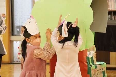 ライオンはお肉を、ユニコーンは魔法のキャンディーを、「森のひなまつりパーティー」のための食べ物を集めます。(年中組)