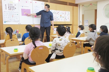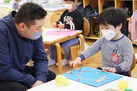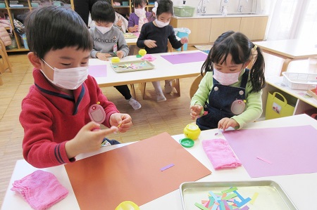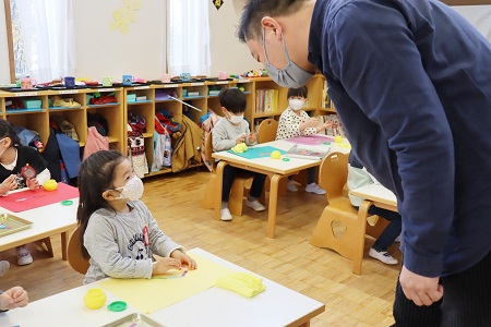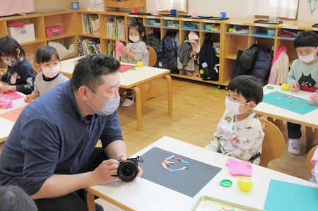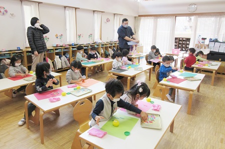 造形の時間が始まる前の心の準備や作品制作に取り組む姿勢がいつの間にか身についてきた年少組の子どもたち