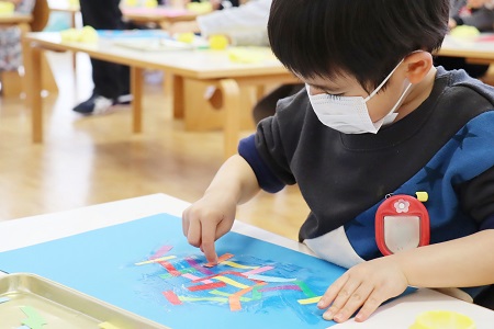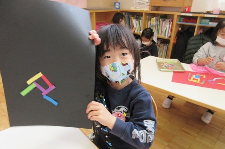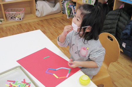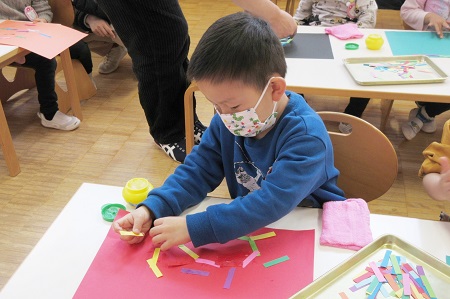 今回は色画用紙とのりを使った作品作りをしました。最初に好きな色の画用紙を各自が1枚選びます。その紙に、小さな短冊状に予め切られたいろんな色の用紙を何枚ものりで貼りつけて、好きな形を表現していきます。制作がスタートすると、のりで用紙を次々と貼り付けて、あっという間に画用紙に色鮮やかな模様ができあがりました。「のりっていろんな塗り方があるよね。みんなどんなふうに塗ったかな?」。先生が聞くと次々に手が挙がりました。「画用紙にのりをつける」「最初に用紙のはじっこにだけのりをつける」「画用紙に、貼り付ける用紙を載せてその上からのりを塗る」。のりを塗る方法を先生に聞く前に、制作に取りかかった子どもたちですが、いろいろなやり方で上手に貼り付けることができました。自分と違う方法もあること、どれも正解だけど使う場面や素材によって使い分けると良いことも教えてもらいました。