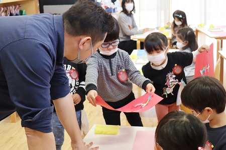 制作が終わった後、最後に少しだけ「のり付け」について、何通りの実践方法があるのかを、みんなで確認してみました。自分で考え工夫しながら実施したすぐ後というタイミングもあり、子どもたちにとって興味深いトリートメントとなった様でした。