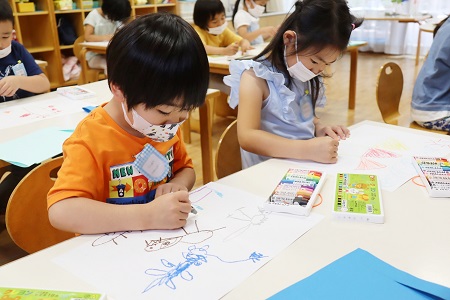 「幼稚園の窓からは何がみえるかな?」。実際見える景色から、子どもたちが見たい景色を想像して画用紙に描いていきました