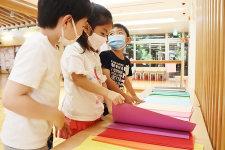 今度は窓枠になる色画用紙選び。どの色がいいかずっと迷いながら決める子、さっと選ぶ子とさまざま