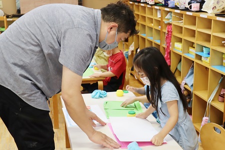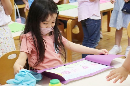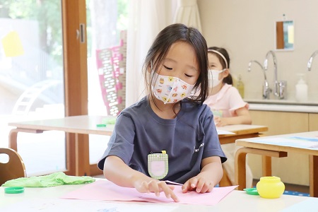 「みんなのお家の窓からはどんな景色が見える?」智力先生の質問に「公園!」「木が見える!」「お庭!」と色々な声が上がります。「もし自分だけの窓があったらどんな景色が見たい?自分だけの窓だから何でも好きなものでいいんだよ」。先生が問いかけると、子どもたちの中に自由で楽しい色々な景色が浮かんだようです。この日は、画用紙にクレヨンで子どもたちが見たい景色の絵を描き、もう1枚の色画用紙に定規とえんぴつ、ハサミを使って窓を作り、2枚の画用紙をのりで貼り付けることで、窓を開いたらそれぞれの景色が見えるという作品作りに挑戦しました。たくさんの道具を使用し、いくつもの工程を重ねて行う造形活動は、道具の扱いができるだけでなく、最後まで作品を仕上げる集中力が必要です。さすが年長組の子どもたち、作品作りに取り組んだ全員が途中で飽きたり、諦めたりせず一気に作品を仕上げました。出来上がった作品の窓を開いてみると…そこには一人一人の見たい景色が広がりました。自分だけの窓をそっと開ける子どもたちの顔はとても満足そう。終わりのご挨拶で「次の造形の時間も楽しいことしたい!」という言葉が出るほど、次回の造形活動が楽しみのようでした。