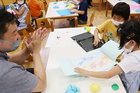 画用紙の窓を開くと、自分たちが描いた見たい景色が現れました。窓を開いたときの表情はみんなとても満足そうでした