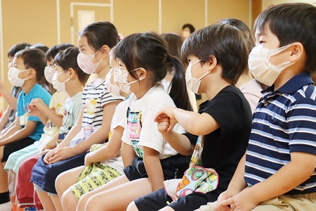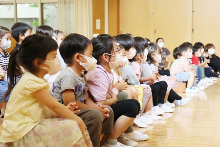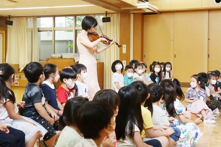 ピアノの演奏者が入場して演奏がスタート。途中からコントラバス、チェロと楽器が一つずつ加わり、5人の演奏者が揃って『きらきら星』を演奏しました。1曲目が終わると演奏者と楽器の紹介がありました。「この楽器、知ってるかな?」。演奏家の方が紹介する前に「知ってる!」「ヴァイオリン!」と子どもたちから声があがりました。楽器の大きさによって奏でる音の違いや、どのように演奏するかを教えていただきました。その後は子どもたちにも馴染みのあるディズニーの楽曲や、クラシックバレエのワルツの演奏を楽しみました。「素敵な演奏でしたね。もっと聴きたいときはたくさん拍手をしましょう」。教師が伝えると、会場から大きな拍手が贈られました。アンコールは『ドレミの歌』。リズムに合わせて自然と身体が動く子どもたち!!間近で本物の演奏に触れる、貴重な機会となりました。
