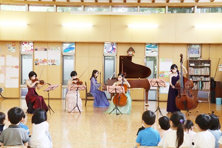 6月10日(金)、幼稚園のホールで音楽鑑賞会が行い、学年ごとに3回に分かれて鑑賞しました。ピアノ、ヴァイオリン、ヴィオラ、チェロ、コントラバスを務める5人の演奏家によるコンサートです。