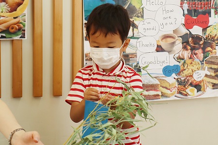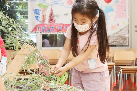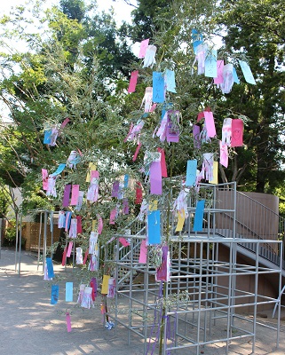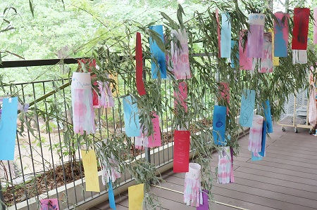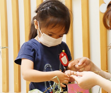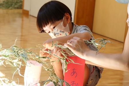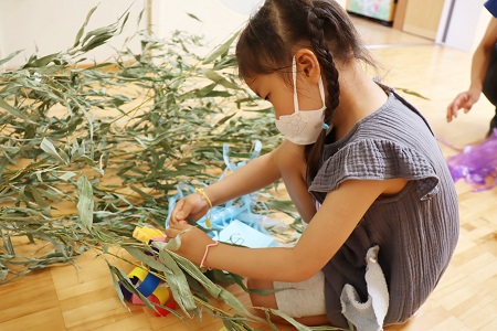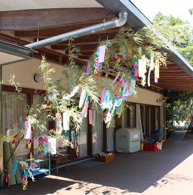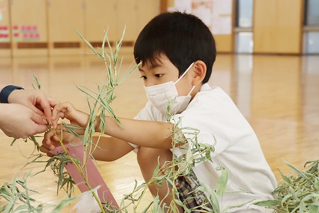 七夕にむけて、7月1日(金)に幼稚園で笹の飾り付けをしました。願い事や将来の夢を描いた短冊と手作りの飾りを、大きな笹に一人一人つけていきました。短冊には「ひさしぶりににじがみたい」「サッカーのせんしゅになりたい」など思い思いの願い事や夢が書かれていました。飾り付けをしながら、担任の教員と短冊に書いた願い事のお話をしながら飾り付けをする子どももいました。全員に飾り付けられた笹はそれぞれの保育室へ。みんなの願い事が叶いますように。