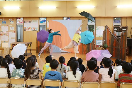 今回鑑賞したのは『とかとか』というお芝居。太陽が大好きなてんとう虫と雨の日が大好きなかたつむりが登場するお話です。「一緒に遊ぼうよ!」とお互いを誘いますが、てんとう虫は雨の日が苦手、かたつむりは晴れた日が苦手、なかなか一緒に楽しく遊べなかったのですが、雨上がりの日に一緒に遊んだ2人は「一緒にあそぶと楽しいね!」と最後は笑顔に。元気なてんとう虫とのんびりなかたつむりの予想のつかないストーリー展開に夢中の子どもたち。あっという間に時間が経ってしまいました。演者さんたちのコミカルな動きやセリフで大きな笑いが起こる場面がたくさん散りばめられた、楽しい劇鑑賞会となりました。