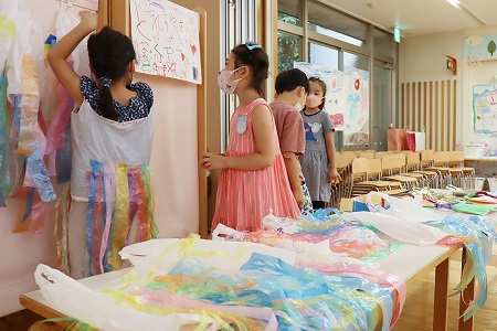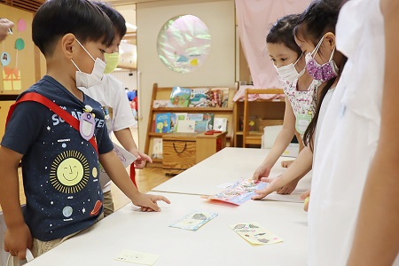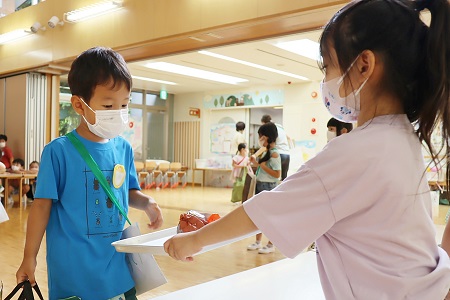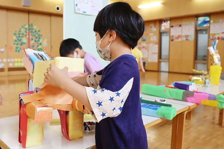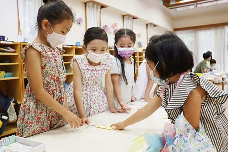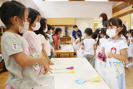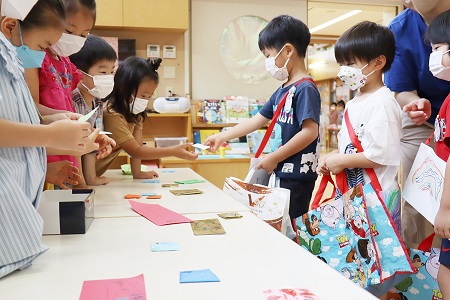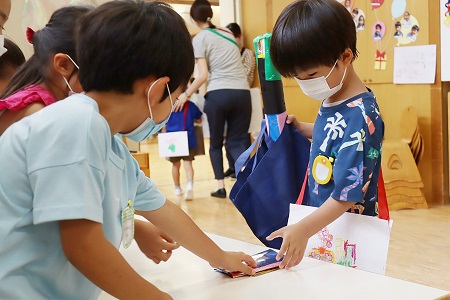 7月20日(水)、お店やさんごっこをしました。パンとジュースやさん、ドレスとバッグやさん、おもちゃやさん、お花やさん、けんとドリルやさん、しおりやさんの7つのお店を年長組が準備しました。お客さんは年中組と年少組の子どもたちです。お買い物バッグと手作りのお金が入ったお財布を持って、買い物に来てくれました。「いらっしゃいませー!」「これください!」「また来てください!」と声をかけ合いお店は大賑わいです。年長組が製作した品物は見事に完売となりました。「お客さんが来てくれて嬉しかった」「全部売り切れたのが嬉しかった」「いっぱい買ってくれて嬉しかった」「お客さんが来たのに商品が少なくなってドキドキした」と子どもたちから様々な感想が聞こえてきました。お店やさんをした年長組と、お客さんの年中組・年少組が交流しながら楽しいお店やさんごっことなりました。