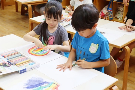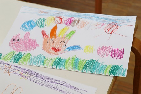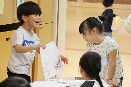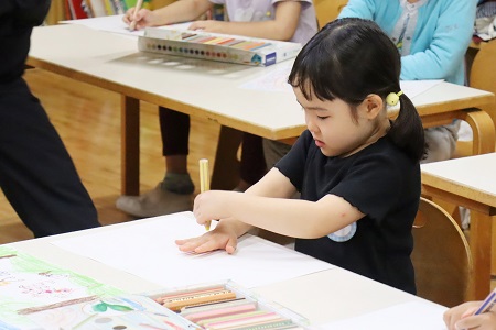最初に利き手と反対の手を紙の上に置き、利き手を使って色鉛筆で手の形をなぞります。「手の形に色々な色を使って絵や柄を描いてみよう。楽しい絵を考えてみてね」。画用紙と色鉛筆を受け取ると、早速、自分の手をなぞりかたどってみます。カラフルに色を塗ったり、お花や木を描いたり。個性が光る作品が次々に完成しました。