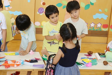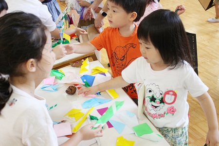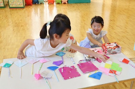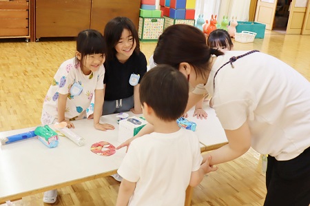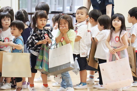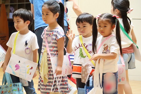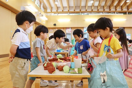 お買い物が終わると、「買ってくれありがとう」「売ってくれてありがとう」と声をかけ合った子どもたち。「楽しかった」「買ってもらえて嬉しかった」「全部売り切れたのが嬉しかった」「たくさんお客さんが来て、あたふたした」と様々な感想が聞こえてきました。お店やさんをした年長組とお客さんの年中組、年少組が交流しながら楽しいお店やさんごっこができました。