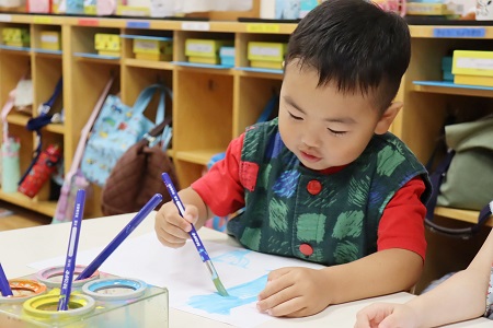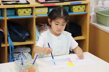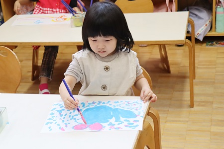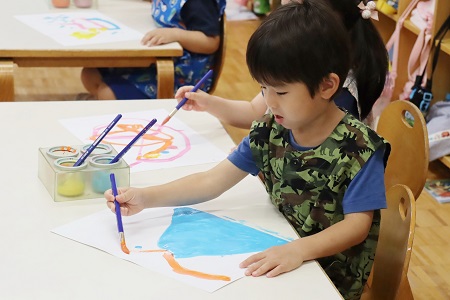 「雨は上から下に降ってくるね。反対に、下から上に向かうものは?」先生が問いかけると、「飛行機!」「花火!」「火山の噴火!」と様々に答える子どもたち。それぞれが思いついた、下から上に向かうものを絵に描いてみます。絵の具の使い方や、使いやすい筆の持ち方も教えてもらいました。「見た人に絵が伝わるように考えながら描いてみようね。例えばお花を描いたら、そのお花はどんな場所に咲いているかな。分かるように描いてみよう」。子どもたちは想像を膨らませながら、楽しそうに取り組んでいました。