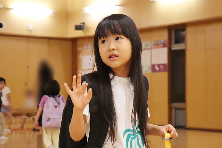 ホールで集合写真。お友だちとポーズを考えていました。