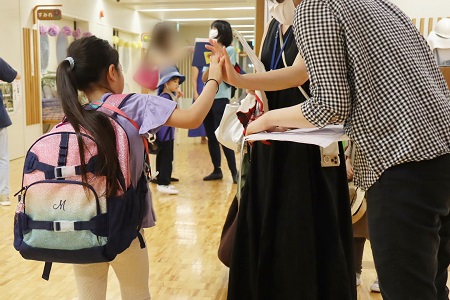 ご家族の方とお別れのあいさつをする子どもたち。心なしか不安そうな表情