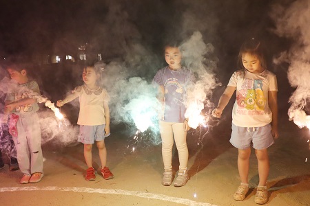 この日の登園は19:00。「こんばんは!」といつもと違うあいさつを教師たちと交わしながら登園しました。園舎でご家族の方とお別れしたあとは、盆踊りや花火、お楽しみ会などを行い、みんなで楽しい時間を過ごしました。就寝時間が近づくと、各保育室へ分かれて就寝準備。同じ部屋の友だちと力を合わせて布団を敷き、自分たちでパジャマに着替えました。