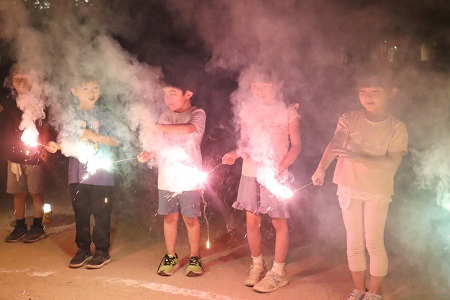 初等学校のグラウンドへ移動して花火をして楽しみました