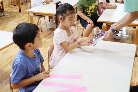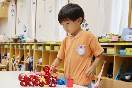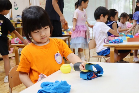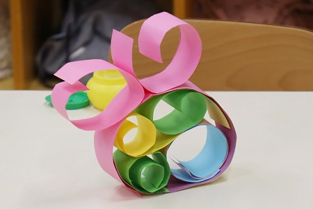 最初に好きな色の画用紙を選び、くるくる巻いて丸めます。次に、丸めた紙同士をのりで自由につなげていきます。「くるくる丸めた紙をくっつけると、どんな形になるかな。逆さまにするとどんな形になるかな」。早速、紙を巻いてみる子どもたち。「最初に小さく巻くと上手にできるよ」丸め方のコツを発見した子がみんなに教えてくれていました。「くっつけるところを決めたら、紙と紙がぶつかる部分にのりを付けて、しっかり押さえてね」智力先生にのりの使い方を教えてもらい、どんどん紙をつなげていきます。ばら、滑り台、タワーなど楽しい発想の作品がたくさん完成しました。