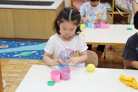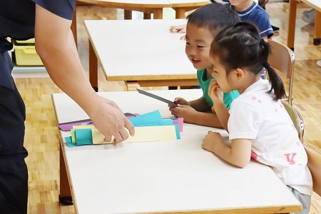 最後に智力先生から「お友だちがどんな作品を作ったかみてみてね。はじめは四角いペラペラの紙だったけど、くるくる巻いてくっつけたら立つようになったのはなぜだろう。みんなで理由を考えてみてね」とお話がありました。完成した作品について自分で考えてみたり、お友だちとお話することで新たな発見や気づきがありました。