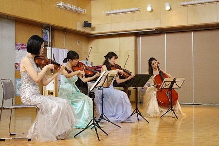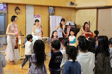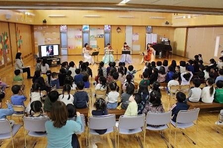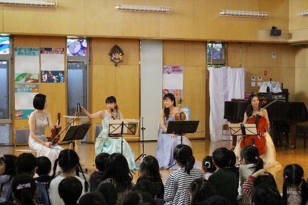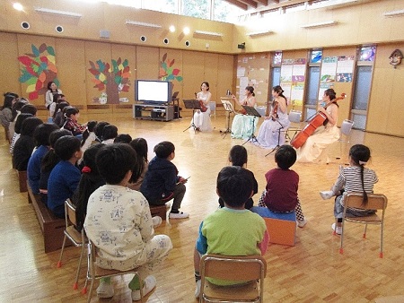 昨年に引き続き、幼稚園の保護者でテレビ朝日の番組「題名のない音楽会」を手掛けておられるお父様の中野俊成さんが企画をしてくださり、チェリストとしてご活躍のお母様の中野万衣子さんとそのお友達(バイオリン、ビオラ)による弦楽四重奏のふれあいコンサートが11月16日(木)に開かれました。