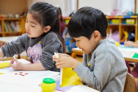 早速、子どもたちもたくさんある折り紙の中から好きな色を選んで、思い思いの形に千切っていき、糊で貼り付けていました。子どもたちが自分でイメージを表現し、既成の形にとらわれずに表現する姿はとても楽しそうでした!