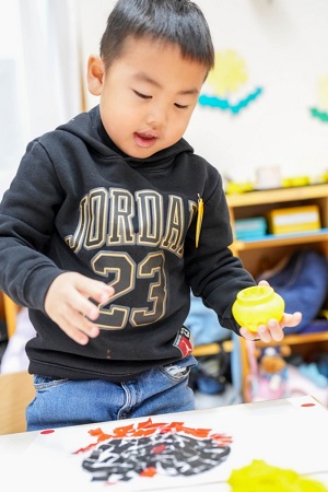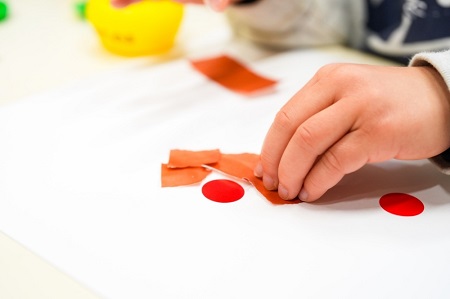 赤丸シールを5枚、子どもたちに渡して、白い画用紙に「どういうふうに貼ったらいいか考えて貼ってみて」と智力先生が問いかけると、インスピレーションのままにすぐに貼っていく姿もあれば、どこに貼ろうかじっくり考えている姿も・・・。「先生貼れたよ!」「出来た!」という声がどんどん聞かれると、「面白い形だね!」「素敵だね!」と智力先生。