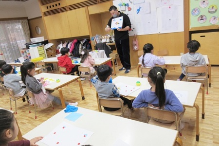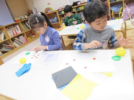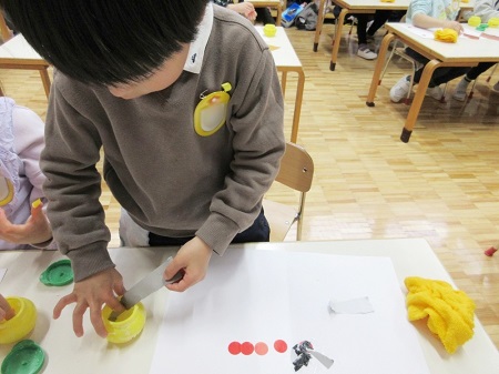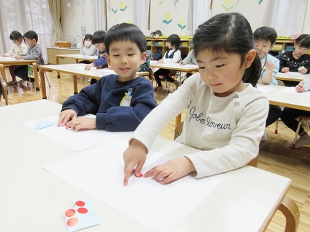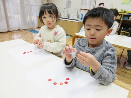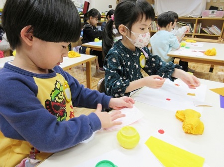 2月5日(月)、年中組が彫刻家の高橋智力先生による造形活動を行いました。今回は、最初に赤丸シール(あかまるちゃん)を使って遊んでみました。