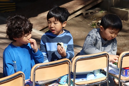 子どもはそのまま未来です。お楽しみランチ、お約束の“塩むすび”は、米塩水で出来ています。肥料も農薬も使わない田んぼでじっくり時間をかけて作られたお米、(年少児の消化を考え、玄米ではなく、4分搗きにしています)低温の温風でゆっくりと乾燥させた“わじまの海塩”を使って握っています。輪島は元日の地震の被災地です。これから復旧にまだまだ時間がかかる見込みですが、ナトリウムとマグネシウムの比率が人の血液のバランスと似ていて、体に取り入れられやすいこのお塩を使い続けて応援し続けてまいります。おかずは可能な限り無農薬無肥料で育てられた、季節を感じられる素材を使うことにしています。初めて見る素材、食べたことのない味付けのものもあるかと思います。食べられても、食べられなくても、知識としてではなく、体験として様々な食材に触れる機会があることを大切にしたいと思っています。
