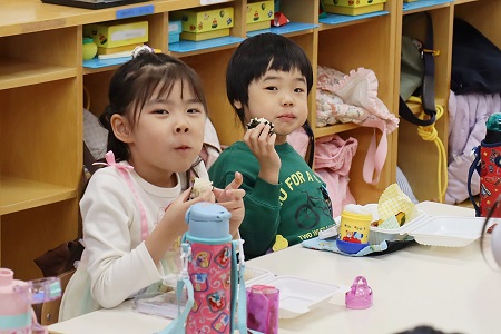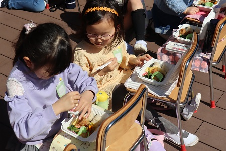 そういう親子の関係性も引き続き大事にしながら、と同時に「みんなで同じお弁当を食べる」ことの良さも取り入れることを検討したいと考えた理由の一つに、嫌いなおかず・食べず嫌いになっているおかずにチャレンジする・克服する機会を提供したいということがあります。これには「お友達が食べているから食べてみようという良い影響があり、とても助かっています」との保護者の方々からのフィードバックもいただけて嬉しく思っています。同世代からの影響力は、親や教師を遥かに超えた力があります。お母様お父様が一生懸命工夫をしても一口も食べなかった野菜を、みんなが食べているから口に入れてみた・・・などという展開になるのも、こういう機会では珍しくありません。それで、偏食が減り、子ども達の健康にプラスになるよう、そういう機会を提供したいというのが私たちの思いです。そして、それは毎日のお弁当でないので実現できることと考えています。