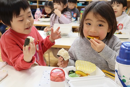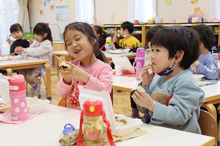 保護者の方の手作りのお弁当にこだわってきたのは、お子さんが楽しんで食べられるよう、お子さんの嗜好を十分に知っていらっしゃる保護者の方がお子さんの好みにあった食材を使ってのお弁当作りができることや、「完食した」という満足感を一人一人が味わえるよう、各自にあった分量の調整ができることなどを考えてのこと。また「どんなお弁当にしたら喜んで食べてくれるかな」と親御さんが考えることが、「今日は何が入っているのかな」と嬉しそうにお弁当を開ける子ども達の笑顔に繋がっていく、そういう親子関係を大事にしたいと考えてきたからです。