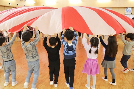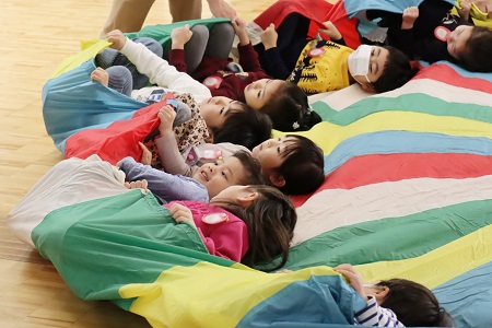 続いては、全員で「機関車と客車」のゲームとバルーン体操を行いました。みんなで身体を動かして大いに盛り上がった後は、教師たちが劇「大きなかぶ」を成城幼稚園バージョンで披露しました。魔女やかえる、妖精、忍者等が次々と登場し、子どもたちも笑顔で観劇していました。