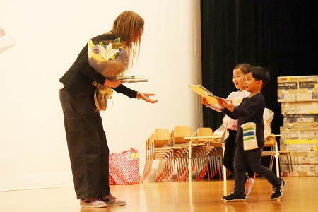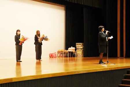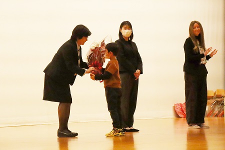 離任式では感謝の気持ちを込めて、お花や絵のプレゼントが贈られました