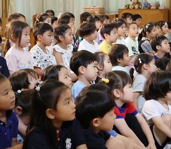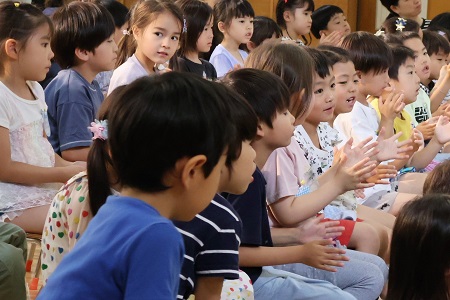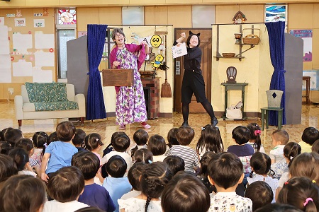 子どもたちはおばあさんとねこの楽しいやり取りにすっかり夢中になり、1時間弱の劇を行儀良く集中して鑑賞していました。演者さんのコミカルな動きに思わず笑いが起きる場面もあり、次どうなるのか身を乗り出すように集中して鑑賞する子どももいました。まるでおばあさんとねこと同じ部屋の中にいて、一緒におじいさんを待っているような感覚になる素敵な劇に、最後に全員で「素敵な劇をありがとう」の感謝の気持ちを込めて大きな拍手を送りました。