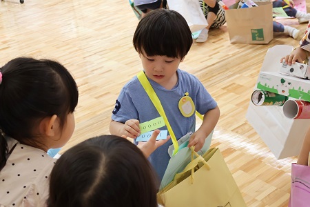 お客さんは年中組と年少組の子どもたちです。1回目は年中組、2回目は年少組、最後は年中組と年少組みんなでお買い物をします。「お店やさんが開店します!来てください!」年長組の呼びかけで、お買い物バッグと手作りのお金が入ったお財布を持ったお客さんが来てくれました。楽しみでわくわくした様子のお客さんにお店を紹介して、早速お買い物スタート。「いらっしゃいませ!」「これください!」。どのお店も次々に品物が売れて大賑わい。すべての品物が売り切れると拍手をして喜んでいました。お客さんも素敵なお買い物ができてとても嬉しそうな様子。「買ってくれてありがとう」お礼を言ってお客さんを見送りました。